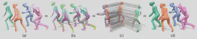 Some demonstrative registration results are shown below, all rendered as raw point clouds. For each animation the points from all other sources are warped to the current view as target. We use datasets from CAPE, DeformingThings4D, DeepDeform, and SAPIEN.